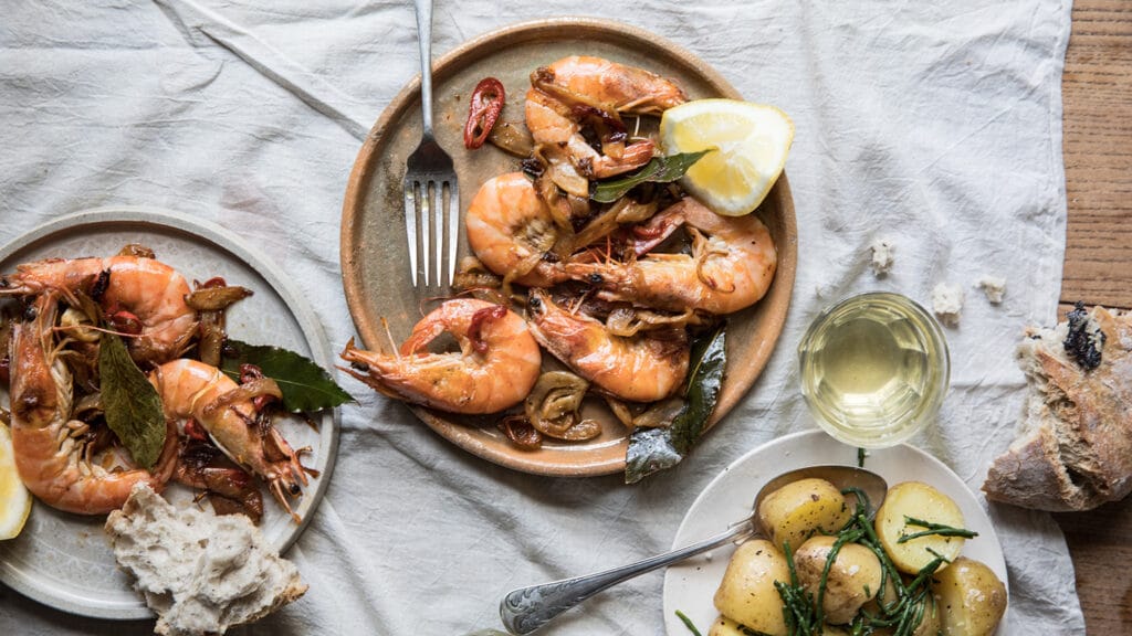 Prawns drowning in olive oil, garlic, chilli and aromatic herbs, served still sizzling