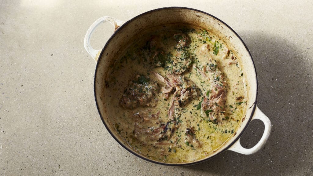 Remove the lid and stir in the cream, bring back to a simmer and cook for a further 30-45 mins or until the cream has thickened and reduced by at least half. When you’re happy with the consistency of the sauce and the rabbit is fork-tender, remove the pan from the heat, season to taste with plenty of salt and pepper. Allow the dish to rest for 10-15 mins.