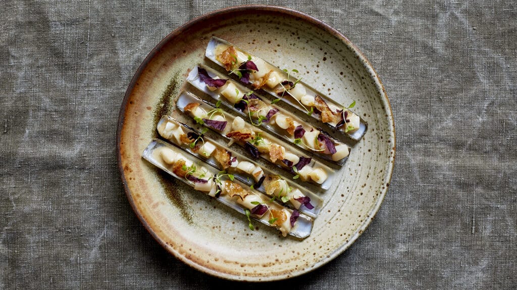 Razor clams with dulse, guanciale & cider