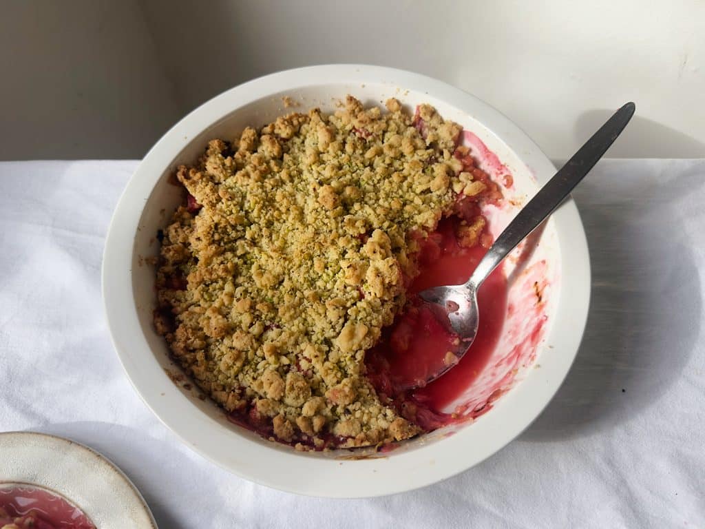 A beautiful spring dessert topped with a luxurious pistachio crumb
