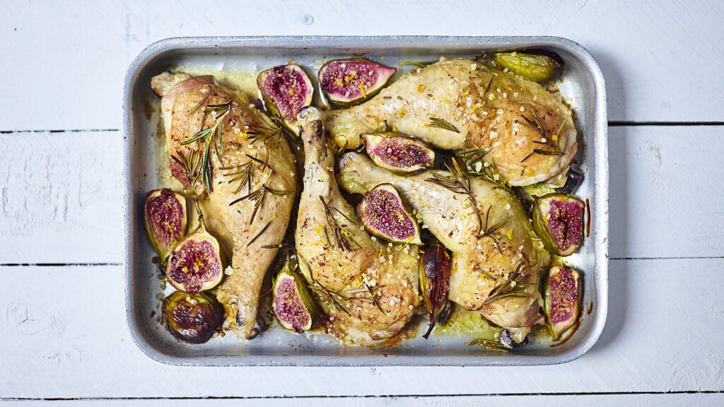 When you’re ready to cook, heat the oven to 220C and quarter the figs. Toss the chicken in a shallow roasting tin with a glug of extra virgin olive oil and scatter over the figs. Bake for 15 mins until golden then turn the heat down to 180C and bake for 20-25 mins more, until cooked through.