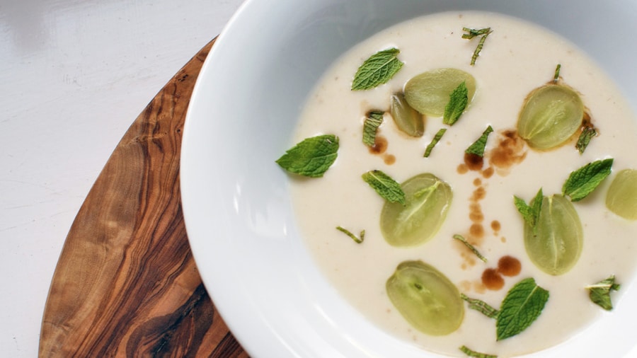 For those taking the chilled option: you will need to thin the soup a little with more almond milk. Ladle into each bowl and top with sliced grapes, a good sprinkle of mint and a dash of sherry vinegar.