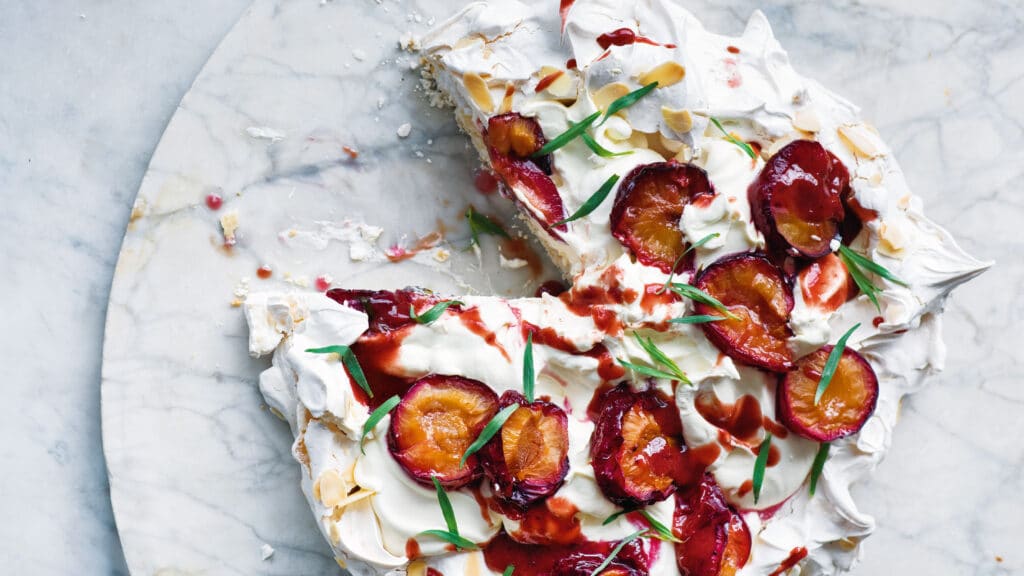 Whip the cream and vanilla extract in a bowl until they reach loose ribbon stage, then spoon on top of the meringue. Arrange the plums and juices over the cream, then scatter with fresh tarragon and the flaked almonds.