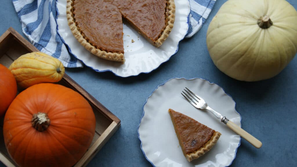 Heat the milk until it nearly reaches boiling then take it off the heat. Beat the eggs, sugar, salt and spices into the pumpkin puree then add in the milk to make a custard. Remove the pie crust from the fridge and carefully pour the pumpkin custard into your pastry lined tin.