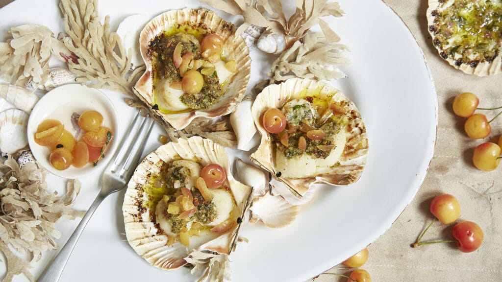 A beautiful summer starter of grilled scallops with golden nuts and piquant cherries