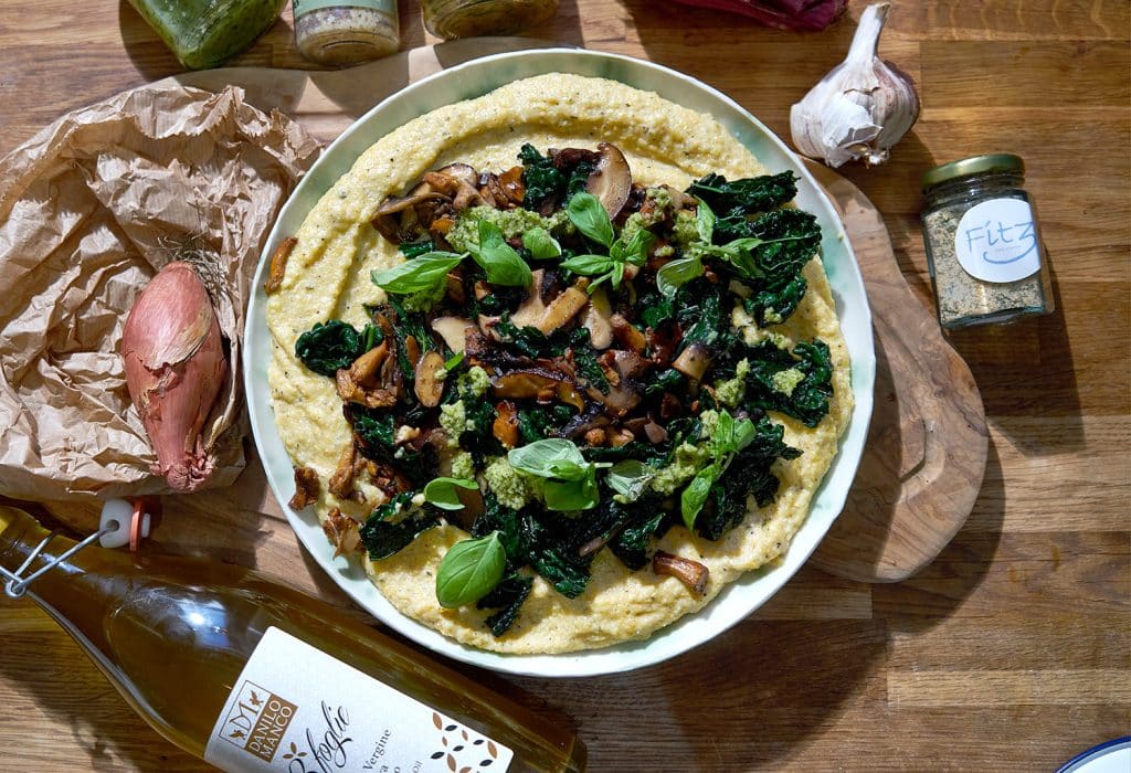 For the polenta, first slice and fry off the shallot in olive oil. Flavour with a little herb salt from Fitz Fine Foods. Add the polenta, pour over 960ml water and bring to a boil. Reduce the heat right down and cook for about 30 mins. Keep stirring as the mixture thickens. Once thickened, remove from the heat, add the mascarpone, gruyere, salt and pepper to taste, and a generous tablespoon of truffle butter. Mix well, then serve immediately.