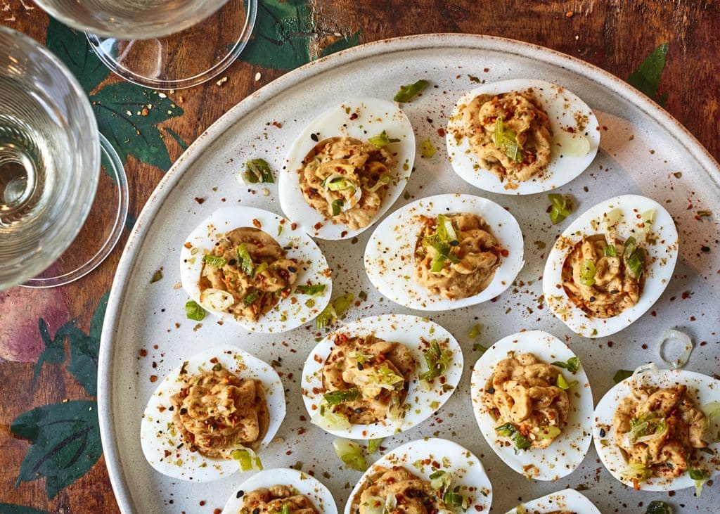 Use a piping bag with a large star nozzle to pipe the filling into the cavity of each egg white. Garnish with the remaining spring onions and a sprinkle over more shichimi togarashi. Enjoy with drinks.