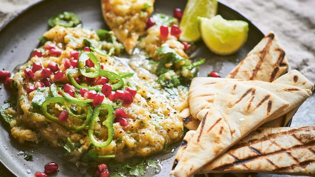 Slow-grilled aubergines with lime, chilli & coriander