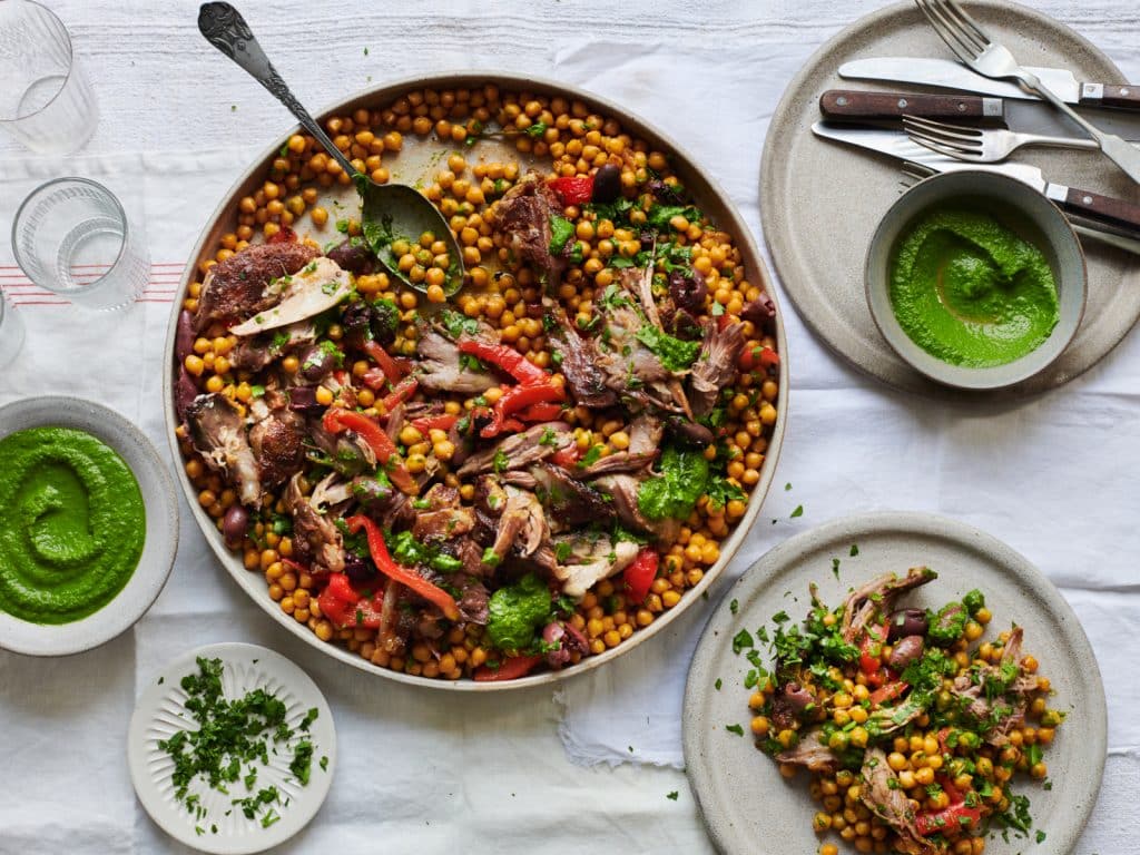 ALTERNATIVE For a vegetarian option, halve aubergines and roast in the oven until soft with a couple of spoons of the marinade. Serve with the pulses, peppers, olives and parsley, along with lashings of extra virgin olive oil and lemon juice. Delicious with the zhoug too.