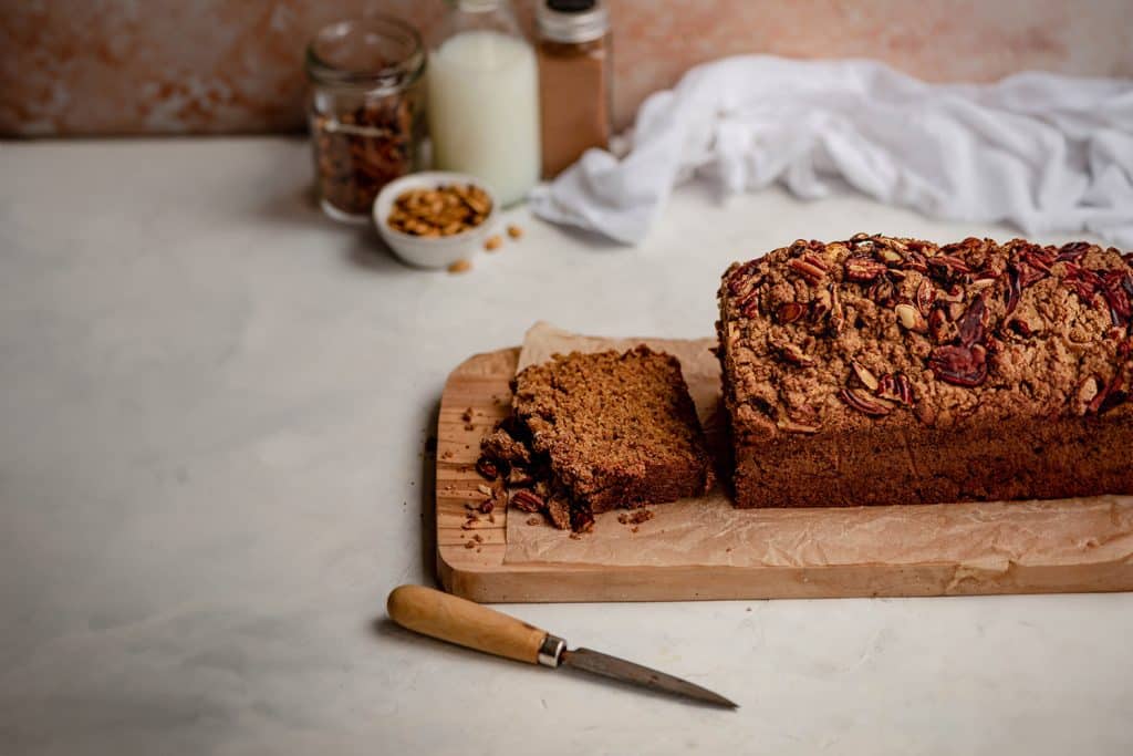 Remove the streusel from the fridge and break it up using a knife or fork to create uniform clumps, breaking some of the larger ones up with your fingers. Sprinkle the top of the batter with streusel, followed by the chopped pecans and roasted pumpkin seeds.