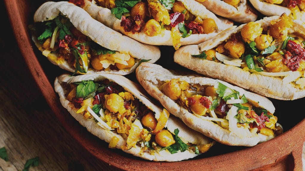 Put the rose harissa into a bowl and stir in a drizzle of olive oil to loosen the consistency a little. Lightly toast the pittas, just to warm them through. Slice open each pitta and spoon the chickpeas inside. Top with a little of the harissa mixture, some grated cheese and a little of the reserved fresh coriander to finish. Serve immediately.