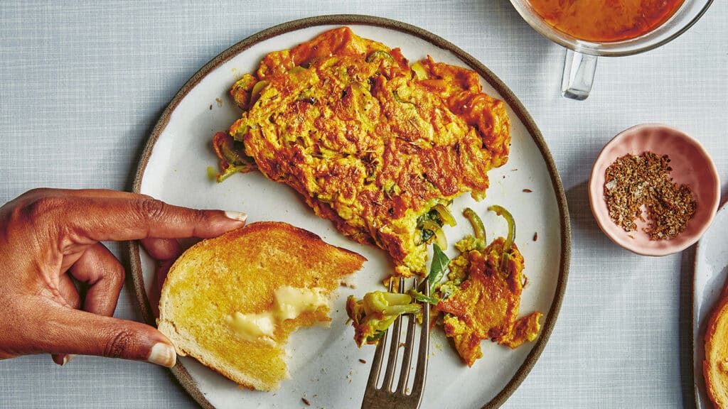 A breakfast omelette with onions, garlic, curry leaves, turmeric and green chillies