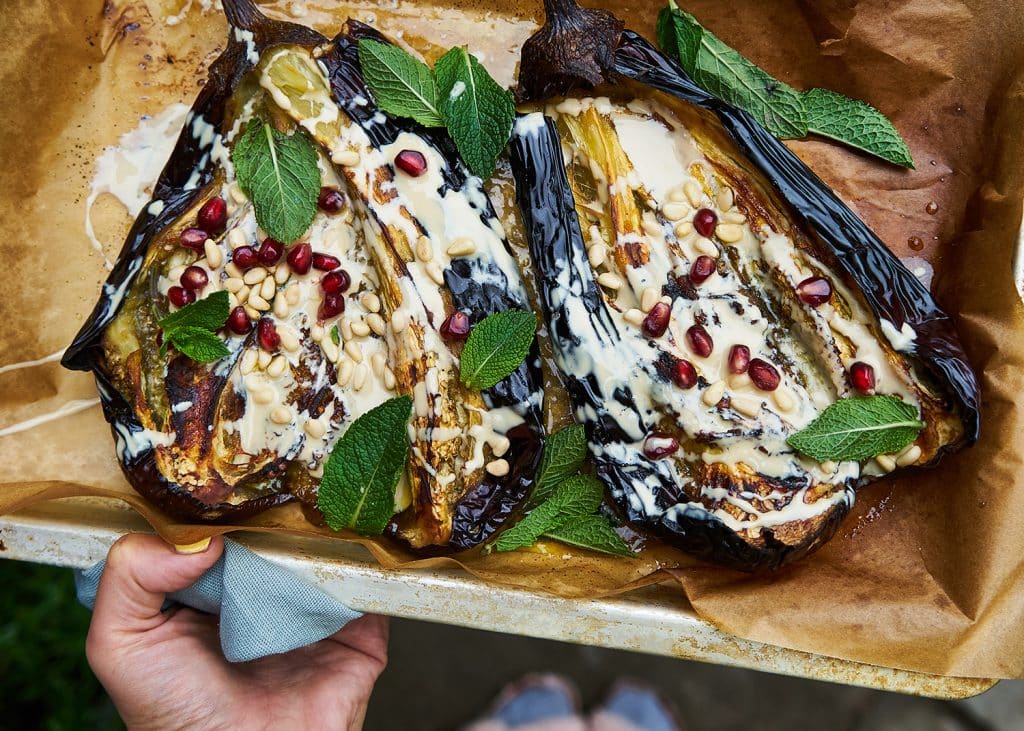 Tender, creamy grilled aubergine with a jammy coating of tahini and chilli