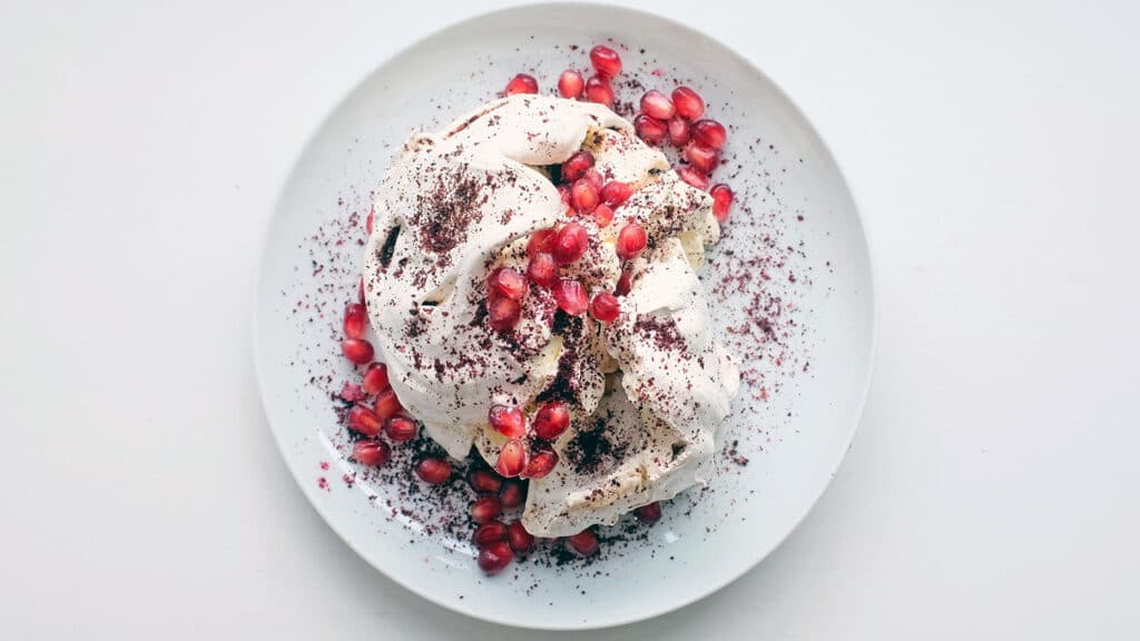 To serve, whip the cream until it just starts to leave ribbons (but no stiffer). Prize each meringue into two pieces along a natural fault line. Dollop cream into this, then scatter with raspberries, pomegranate, any residual juice, then generous pinches of sumac over the top (at least 1 tsp per meringue). Leave the sumac on the table so people can add more as they eat.