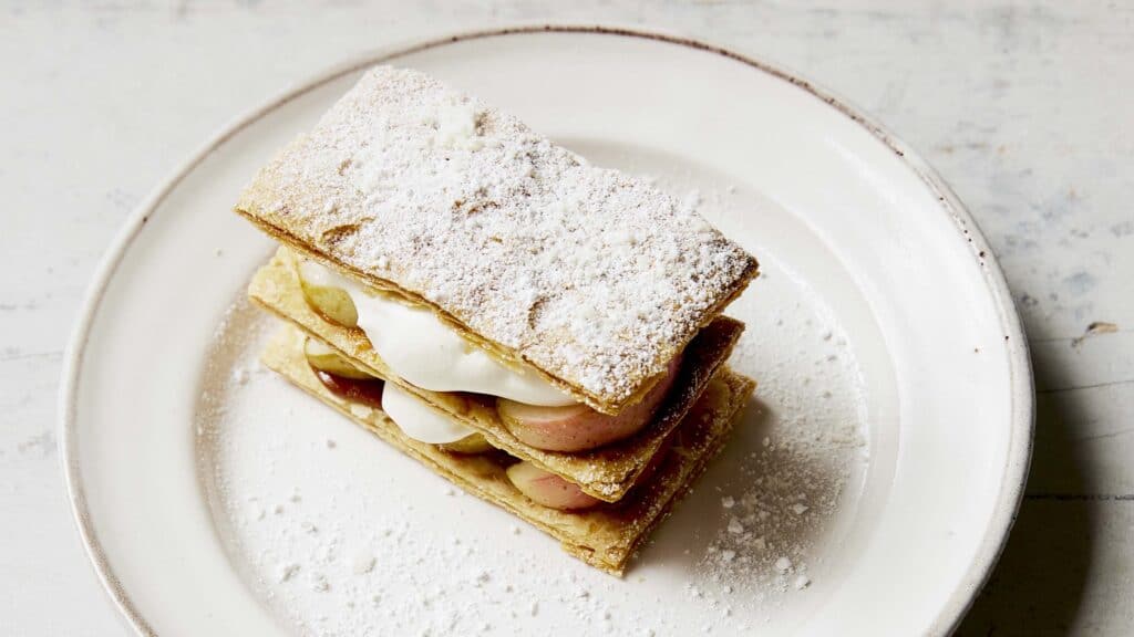 To assemble the mille-feuilles, encourage everyone to take three pastry pieces each. Spread two of them with dulce de leche. Use one as the base, top with apple and a spoonful of cream, then the second dulce de leche slice, more apples and cream, and the final pastry piece on top. Finish with icing sugar and apple powder if you wish
