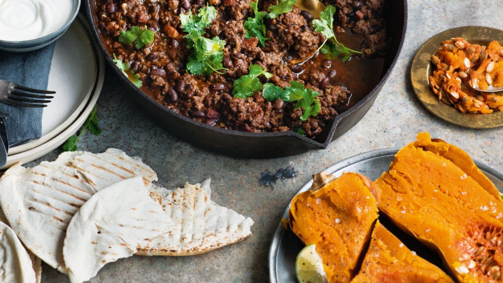 Wipe the squash clean and bake it whole on a small roasting tray next to or under the casserole for around 1½-2 hours, until the skin colours and sinks. To serve, slice it in half and remove the seeds. Tip any juice that’s cooked out back over the flesh and season generously with salt, black pepper and extra virgin olive oil. Serve the chilli and squash with sour cream, plus flatbreads or rice.
