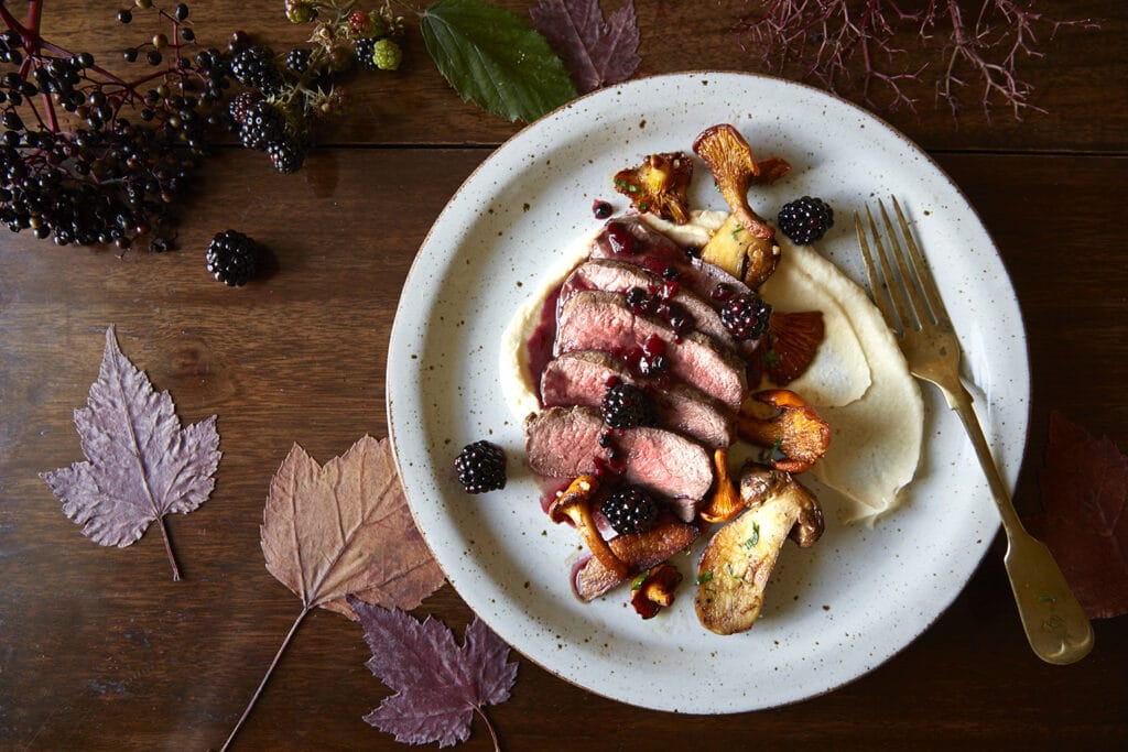 Return the elderberry sauce to a low heat and add a knob of butter. Cook until it’s melted into the sauce then add the blackberries and stir. Taste for seasoning.