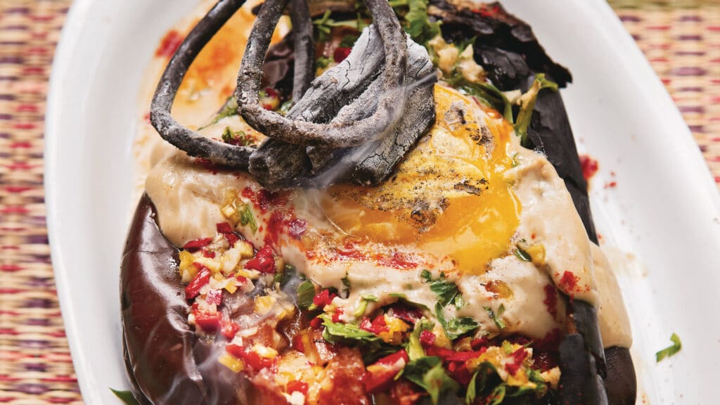 Whole burnt aubergine with charred egg yolk, tahini & chilli sauce