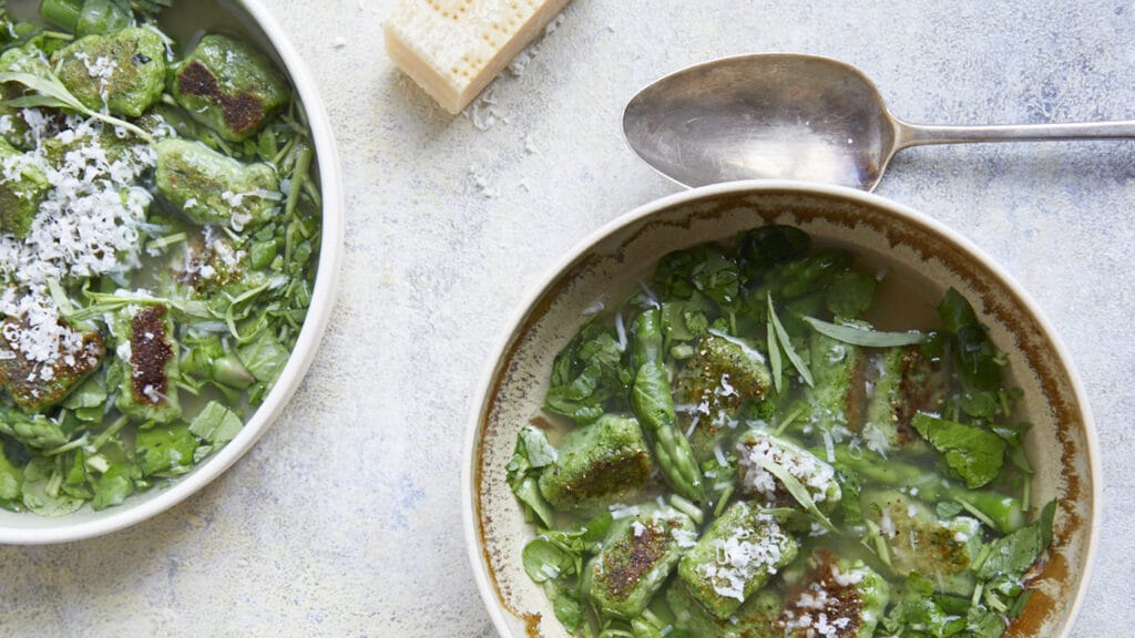 Soft, garlicky gnocchi and tender asparagus in a herby chicken broth