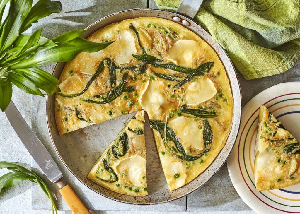 Cook for 2-3 mins so there’s just a little wobble left. Remove and leave to rest and firm up for 5-10 mins, then slip the frittata out of the pan onto a serving plate. This is good eaten warm, at room temperature, or cold from the fridge.