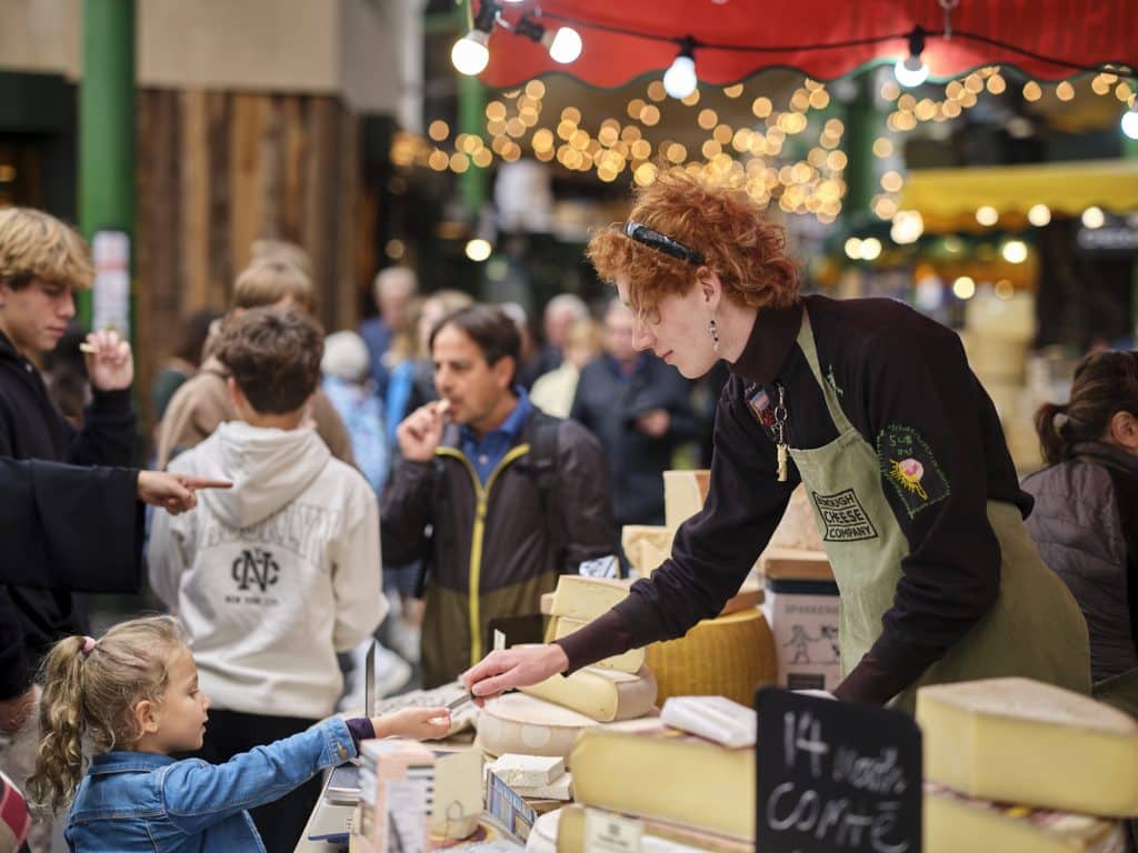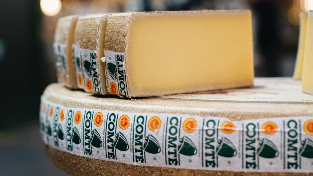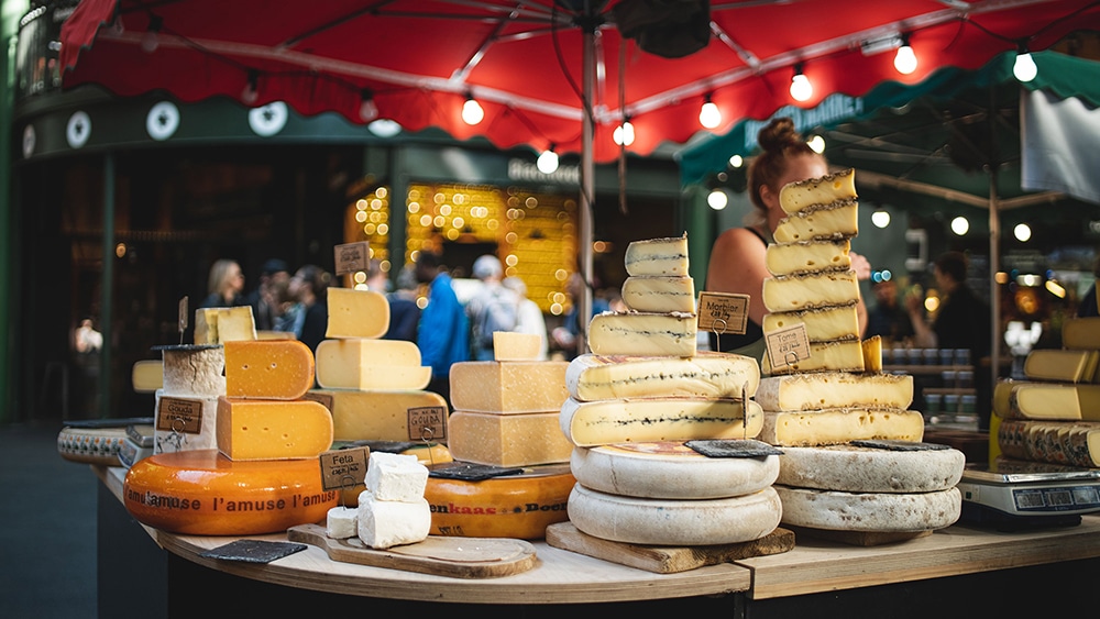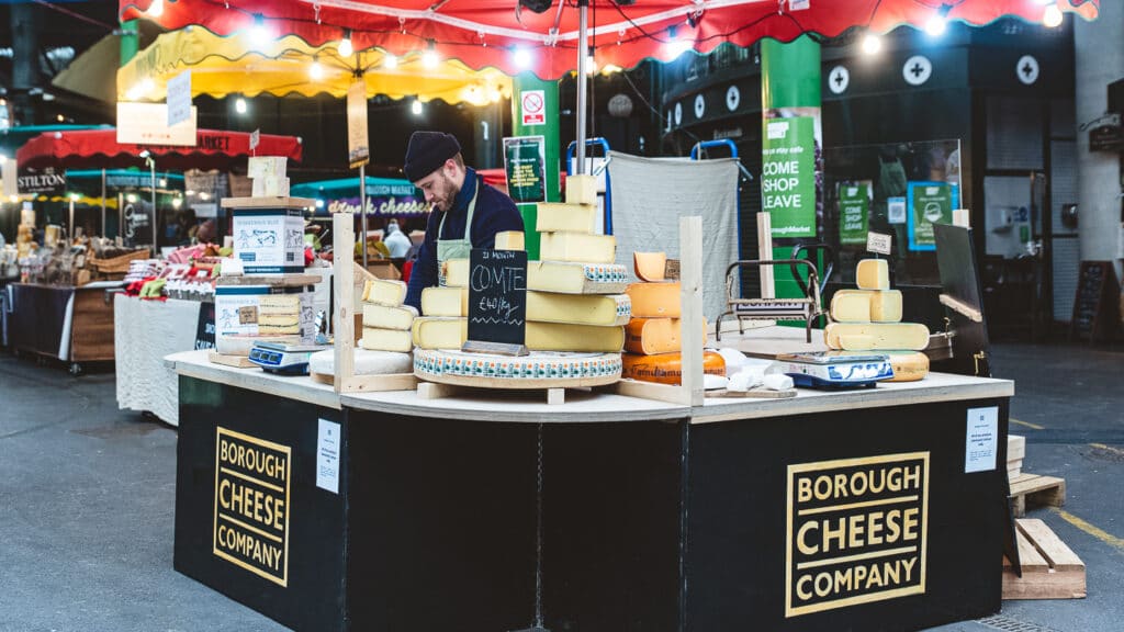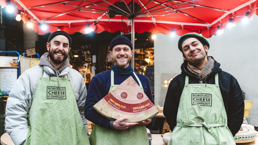 Borough Cheese Company specialises in spectacular wheels of comté cheese made in the Doubs and Jura areas of the Franche-Comté region of eastern France. The cheese is matured in the 19th century Fort Saint Antoine owned by Marcel Petite, one of the most respected affineurs of comté in France. Dominic, who runs the Borough Market stall, visits the fort every six weeks to taste and select the finest comte, as well as a semi-soft, unpasteurised tome. He also sources a raw milk farmhouse gouda from a family run farm in Holland, a raw milk blue cheese from Warwickshire and a delicious Bermondsey Red from much closer to home.